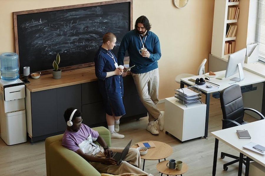 Utilisez l’existant : des étagères peuvent servir de cloisons basses, et des tapis de sport délimitent une zone de regroupement. Des bureaux classiques peuvent être regroupés pour créer de grandes tables de conférence ou isolés avec des paravents en carton pour former des pôles de concentration. L’important est de garder une circulation fluide.