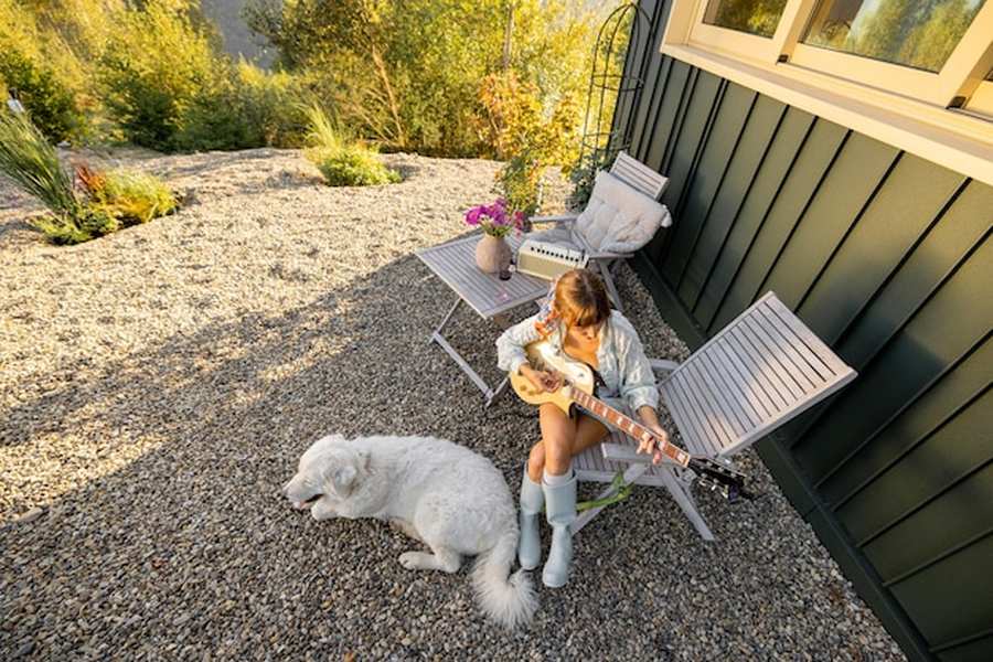Une femme joue de la guitare sur une terrasse en gravier devant une structure en bois moderne, illustrant comment aménager un studio de jardin de moins de 20m2 sans permis de construire : règles, prix et étapes de construction.