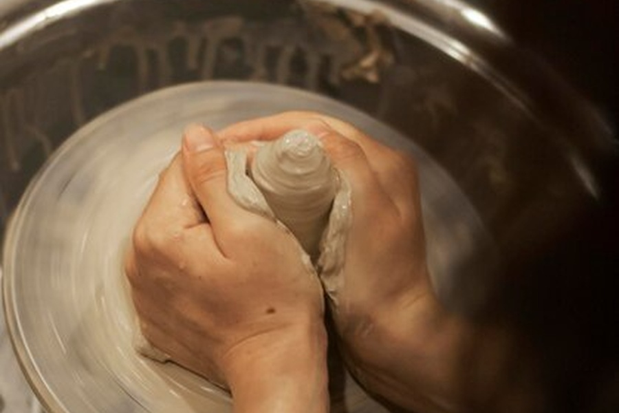 Mains d'un artisan façonnant l'argile humide sur un tour de potier, un exemple classique d'activités manuelles créatives.