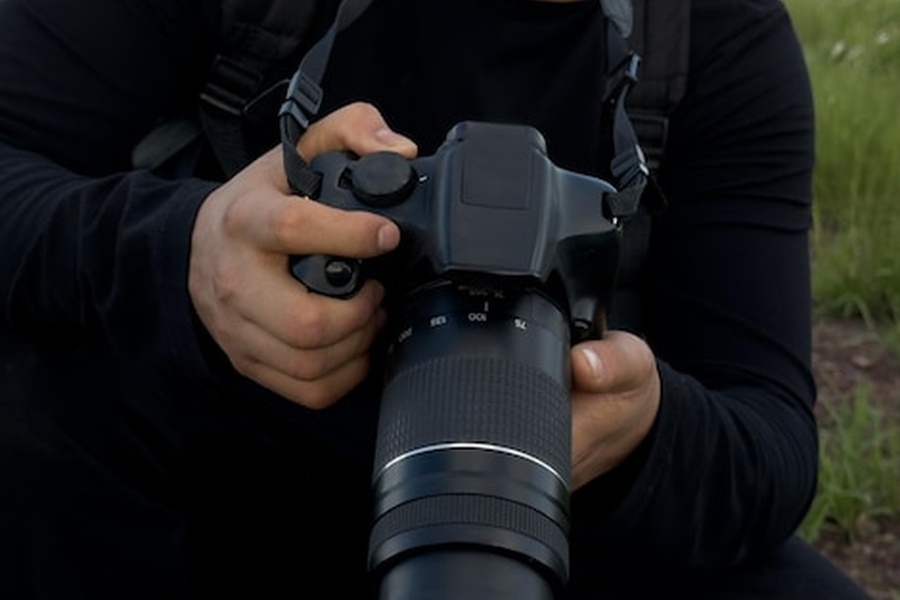 Mains tenant un appareil photo reflex noir avec un téléobjectif en plein air.
