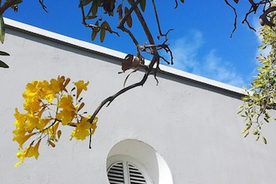 Une façade blanche immaculée avec des volets traditionnels et des fleurs jaunes éclatantes pour illustrer la Climatisation naturelle : Comment rafraîchir sa maison sans électricité grâce aux techniques Low-Tech.
