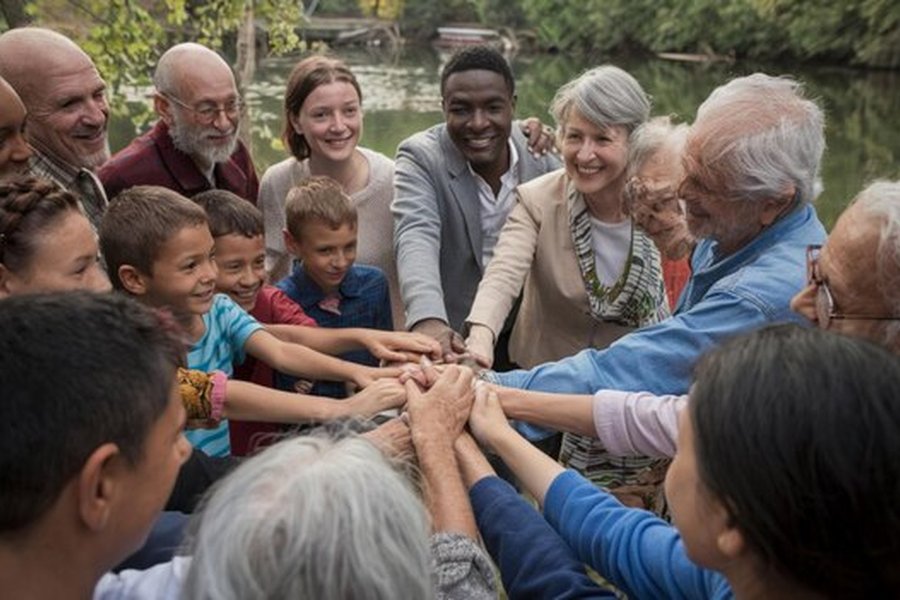 Un groupe diversifié de seniors, d'adultes et d'enfants joignent leurs mains en cercle pour célébrer la cohabitation intergénérationnelle solidaire : le guide complet pour loger un étudiant et réduire ses charges de moitié.