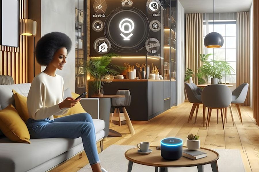 Une habitante pilote ses objets intelligents depuis son salon, démontrant comment configurer un réseau local Matter sans hub propriétaire pour sécuriser sa maison connectée.