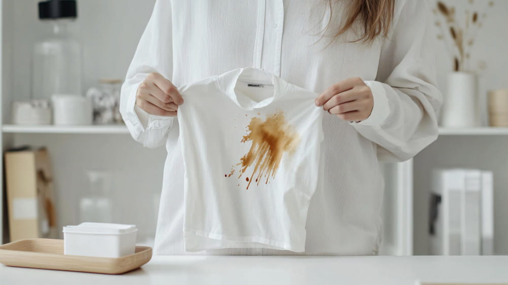 Une personne présentant un vêtement blanc taché de nourriture pour montrer comment efficacement enlever une tache de gras