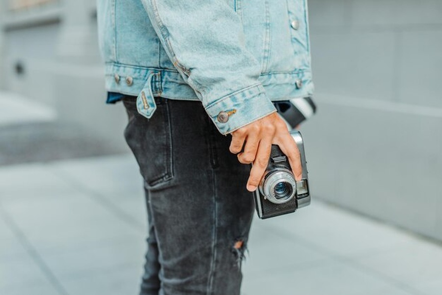 Un photographe urbain prêt à capturer l’instant avec son matériel rétro.