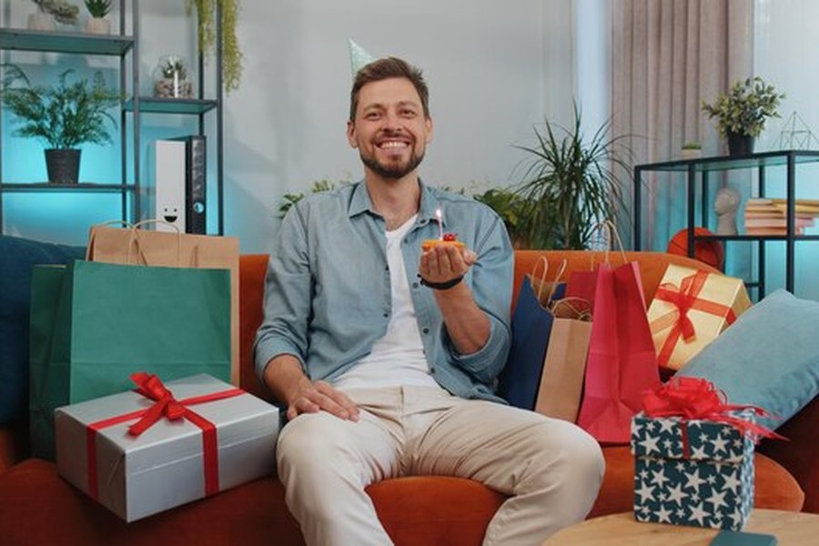 Homme souriant entouré de paquets, une parfaite idée cadeau hommes pour célébrer un anniversaire.