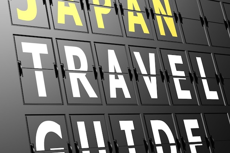 Panneau d'affichage mécanique d'aéroport indiquant 'Japan Travel Guide' pour planifier un itinéraire voyage japon 2 semaines.