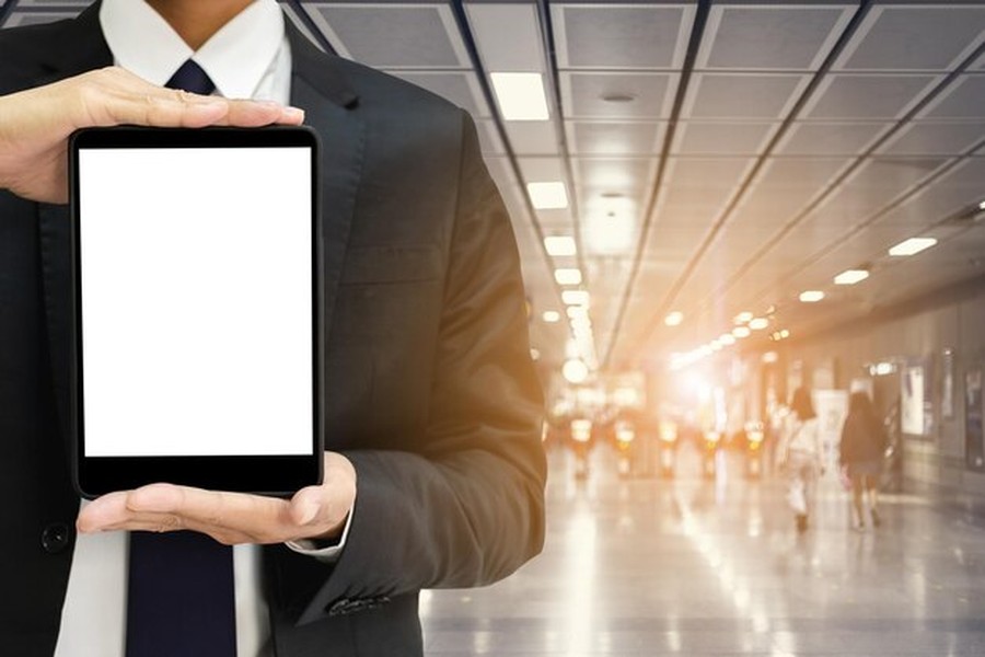 Professionnel en costume tenant une tablette affichant un outil organisation événement dans un hall de congrès.