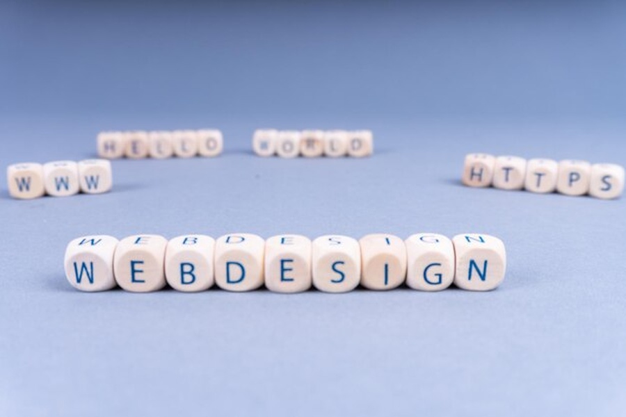 Cubes en bois épelant WEBDESIGN sur un fond bleu épuré, illustrant l'importance de la structure technique traitée dans notre article : Comment supprimer la catégorie 'Non classé' de WordPress : Guide complet pour l'audit et la redirection SEO.